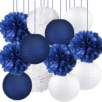 Navy Blue Party Decorations Kit Navy Blue White Tissue Pom Pom Paper Lanterns For Graduation Anniversary Wedding Bridal Shower Baby Shower